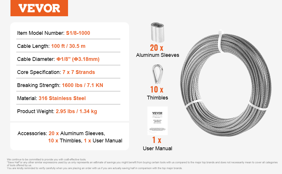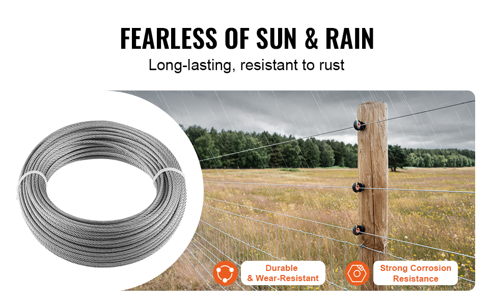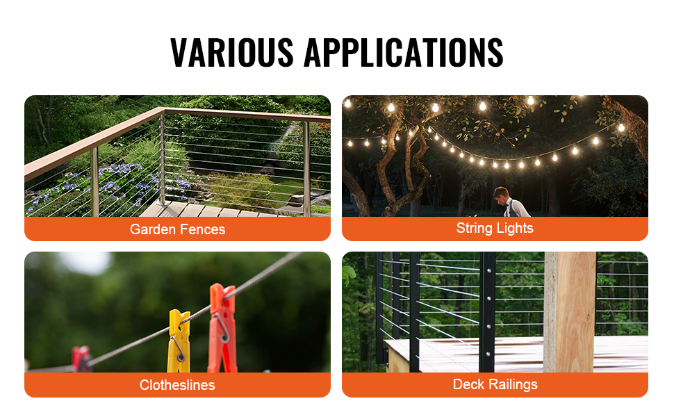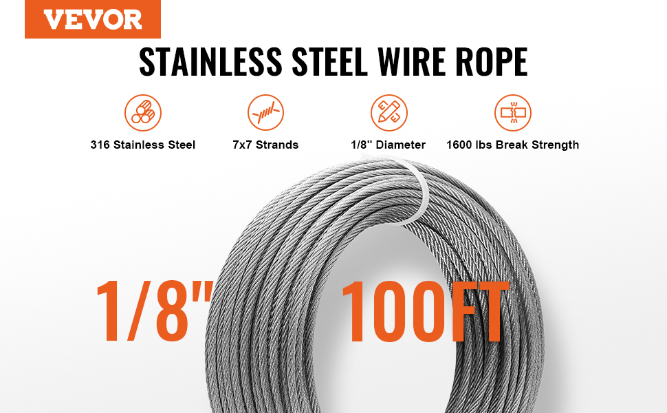 Rust and Corrosion Resistance: Our 100 ft (30.5 m) steel cable is made of premium T316 stainless steel with added molybdenum that comes with a better performance on its breaking strength and anti-oxidation. It is great for outdoor installation that requires a tough quality and longer lifespan.