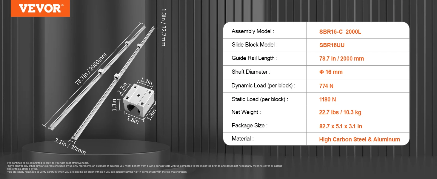 SBR16-2000 mm Linear motion guide rail includes 2 x 78.7 in/2000 mm length SBR16 guide rails and 4 x SBR16UU slide blocks. Dynamic Load Per Block: 774 N, Static Load Per Block: 1180 N.