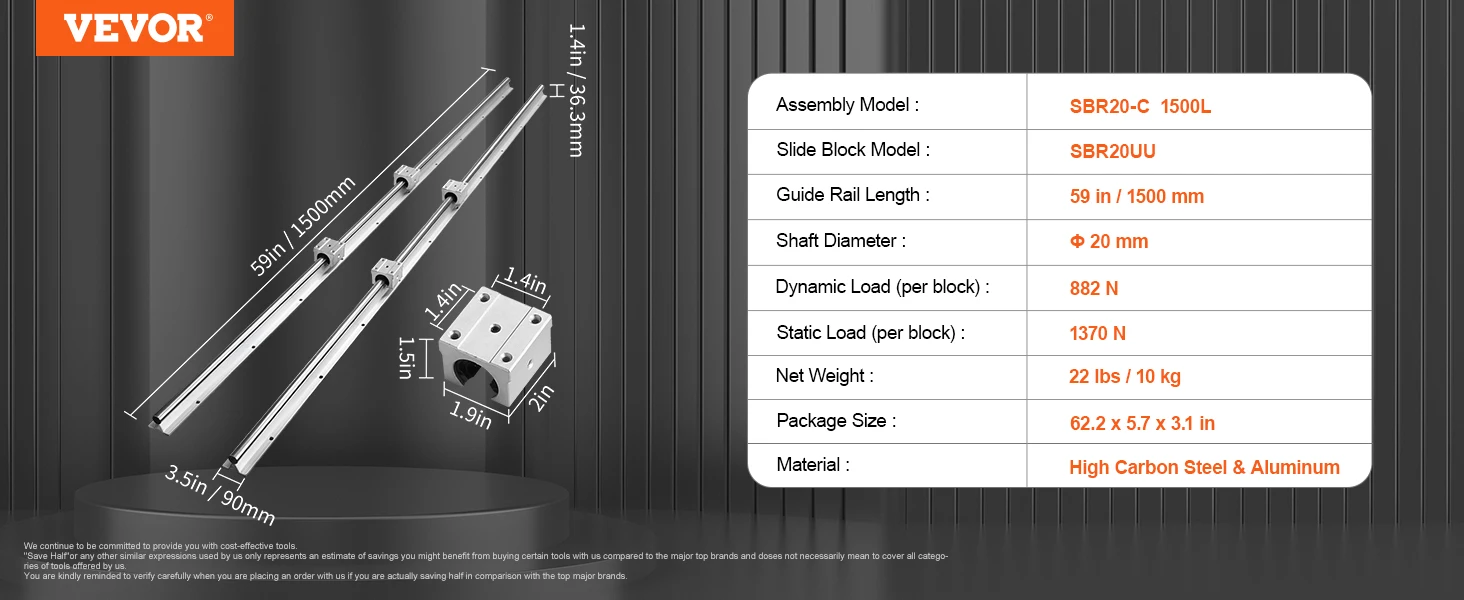 SBR20-1500 mm Linear motion guide rail includes 2 x 59 in/1500 mm length SBR20 guide rails and 4 x SBR20UU slide blocks. Dynamic Load Per Block: 882 N, Static Load Per Block: 1370 N.