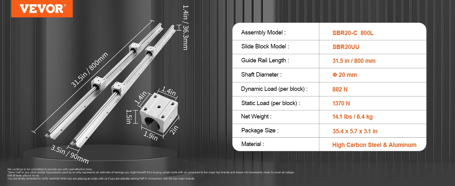 SBR20-800 mm Linear motion guide rail includes 2 x 31.5 in/800 mm length SBR20 guide rails and 4 x SBR20UU slide blocks. Dynamic Load Per Block: 882 N, Static Load Per Block: 1370 N.