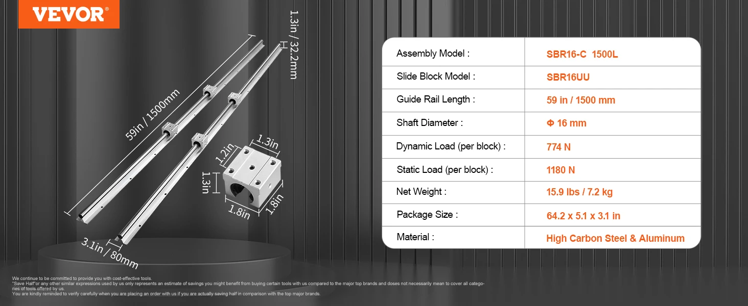SBR16-1500 mm Linear motion guide rail includes 2 x 59 in/1500 mm length SBR16 guide rails and 4 x SBR16UU slide blocks. Dynamic Load Per Block: 774 N, Static Load Per Block: 1180 N.