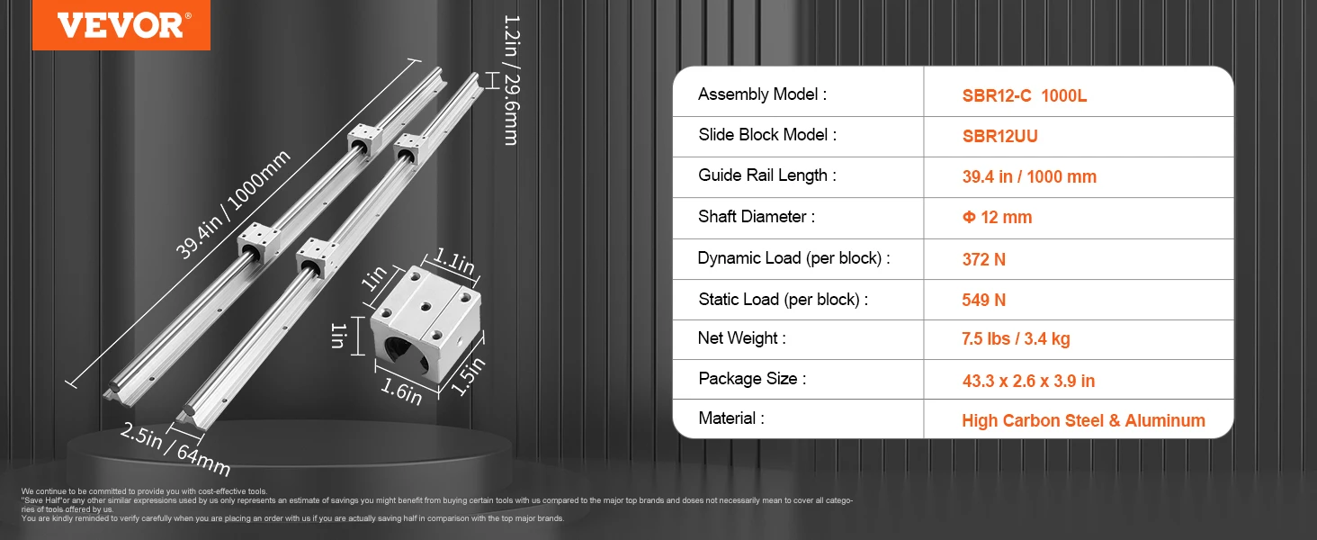 SBR12-1000 mm Linear motion guide rail includes 2 x 39.4 in/1000 mm length SBR12 guide rails and 4 x SBR12UU slide blocks. Dynamic Load Per Block: 372 N, Static Load Per Block: 549 N.