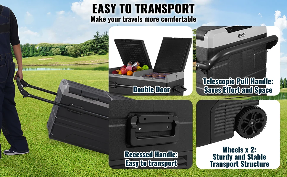 Dual Use for Home/Car: Designed with sturdy wheels and a telescopic handle for effortless and stable transportation. Additionally, the car fridge is equipped with 110/240V AC and 12/24V DC adapters, making it suitable for use at home, on yachts, RVs, cars, trucks, and vans.