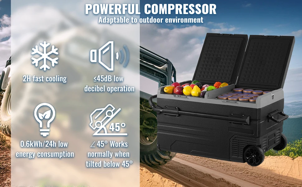 Quiet & Energy Efficient: The fridge operates with noise ≤ 45dB, ensuring you sleep well after long drives. You can also choose between ECO and Max modes via the LCD touchscreen. In ECO energy-saving mode, the operating power of this portable fridge is less than 48W. Even when running in MAX mode (54W), its intelligent circulation consumes less than 1 kWh/day.