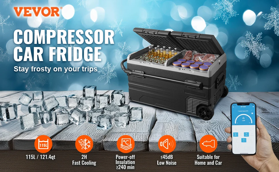 Large Capacity: The portable refrigerator freezer has a dual compartment capacity of 115 L. This robust RV fridge can hold 114 cans of 330ml cola or 59 bottles of 550ml water or 32 bottles of 750ml red wine, accommodating seafood, snacks, meats, and beverages, meeting the needs of short trips such as travel, boating, and camping.