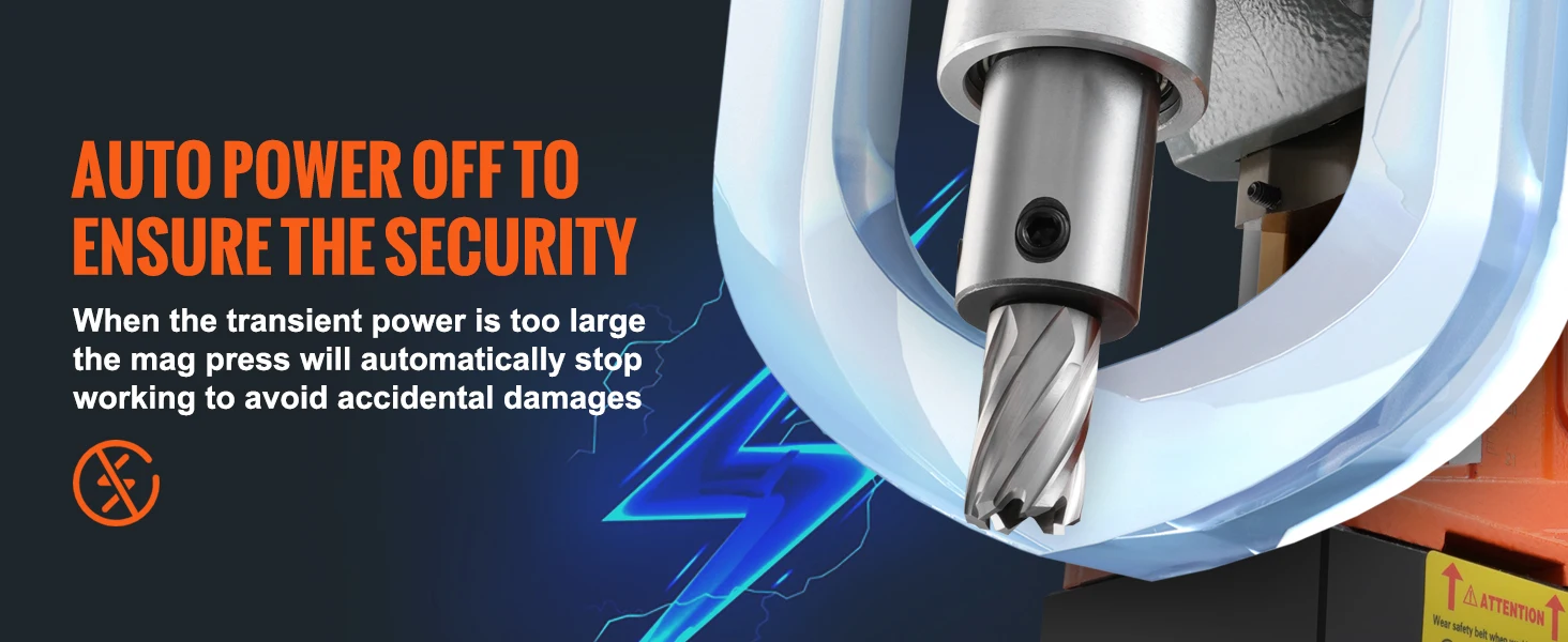 Our electric drill press can generate a power force and perform more efficiently thanks to its powerful motor. With a 12500N holding force, our mag drill can anchor itself on any steel and iron surface tightly to accurately position and drill holes without burr.