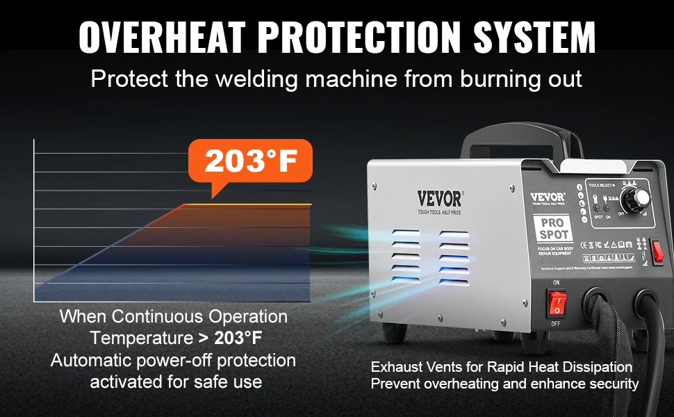 Our spot welding machine is equipped with an intelligent overheat protection system, which activates when the temperature exceeds 203℉, preventing short circuits and machine damage. Tthe side vents also ensure rapid heat dissipation, making welding hassle-free and secure.