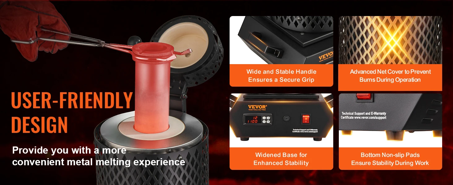 • Durable and Safe: Our melting furnace features premium graphite crucibles for long-lasting durability. The advanced mesh cover for comprehensive protection prevents burns during operation. The operable lid and the non-slip pad ensure secure, stable, and spill-free work. High-temperature gloves provide hand protection during lifting and pouring. Each component includes a wide and stable handle for a firm grip.