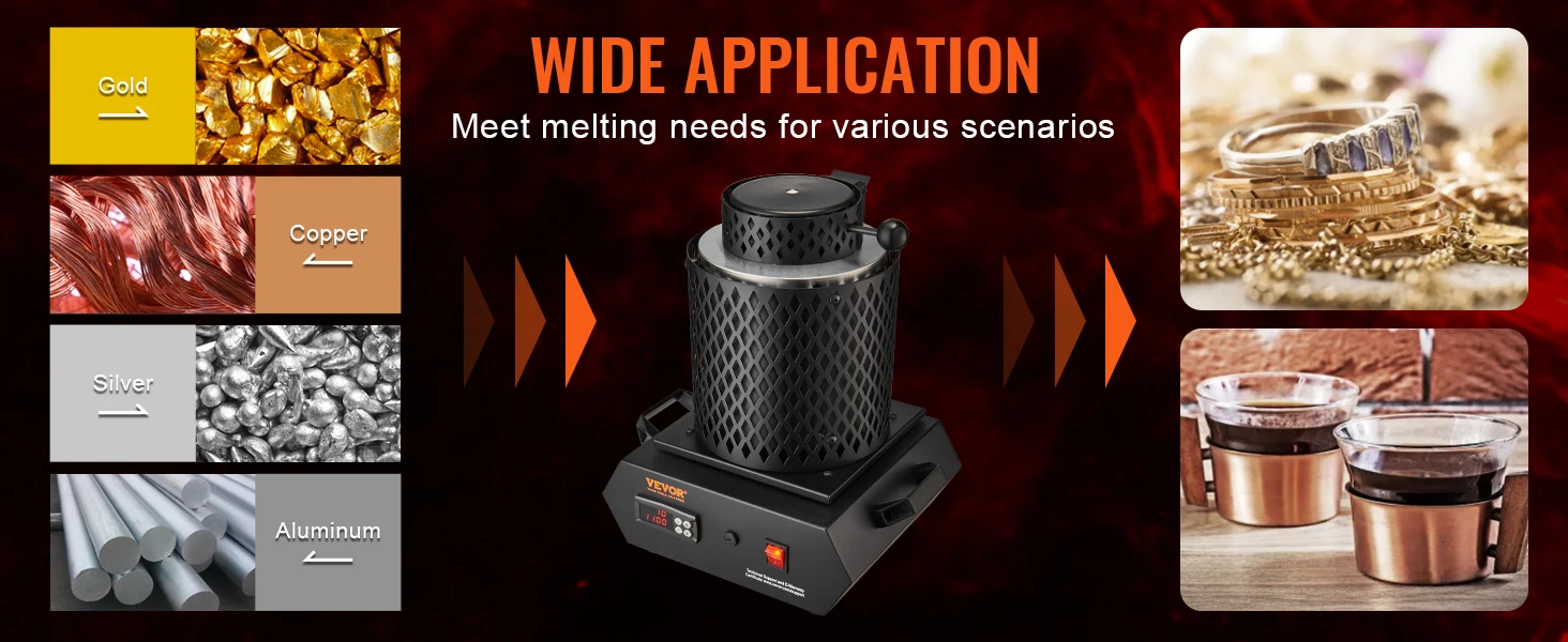 • Versatile Applications: This electric furnace is ideal for producing gold bars, melting precious metals and jewelry, recycling scrap materials, refining jewelry, and casting various rapidly melting metals, including gold, silver, lead, copper, bronze, and aluminum. It is suitable not only for professional industries and workshops but also as a valuable tool for home melting.