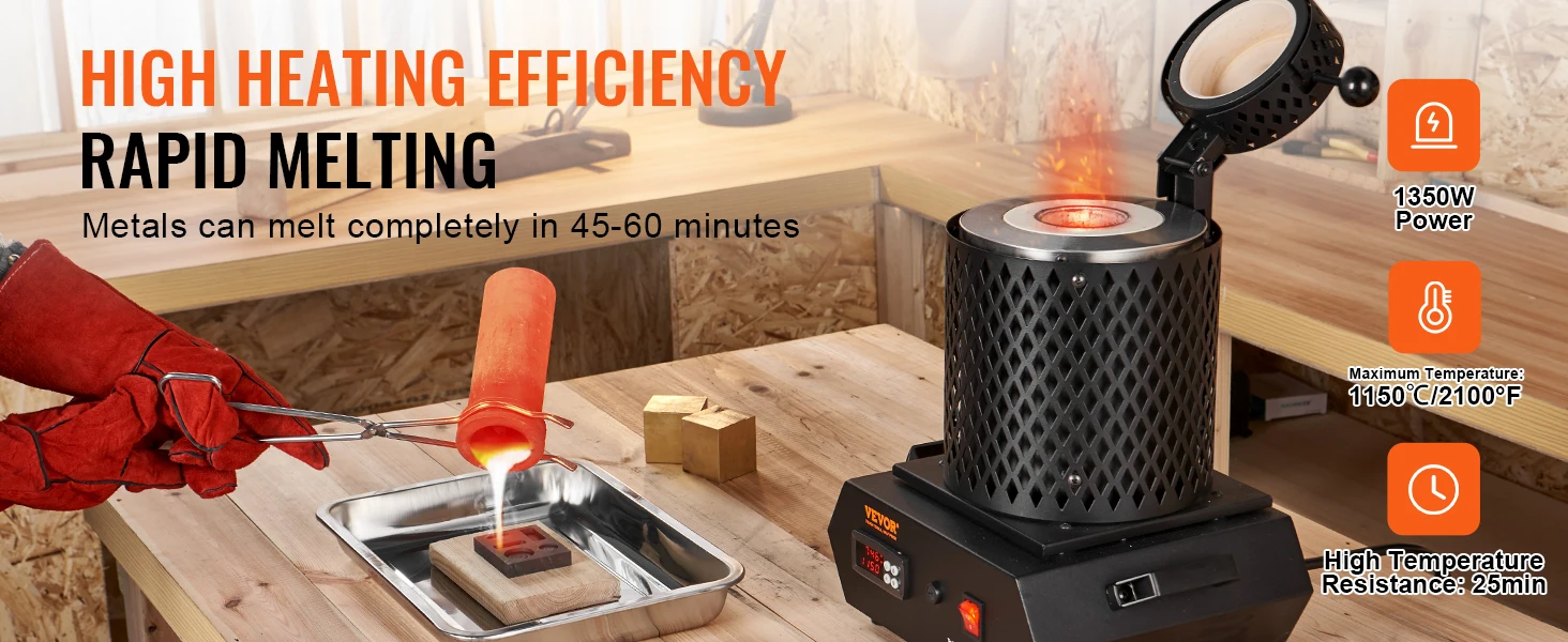 Our 1350W high-power smelting furnace can heat up to 2100°F, and it takes only 25 minutes to reach the max temp from room temp, maximizing heating efficiency. With optimized heating elements and insulation materials, it melts metals with a melting point below 2100°F in just 40-55 minutes.