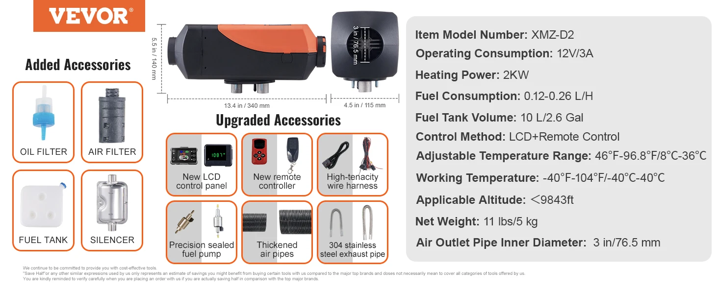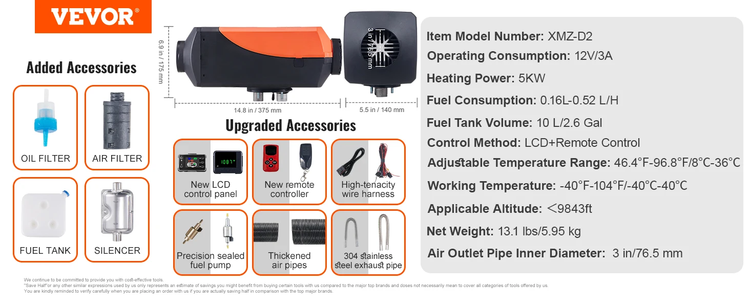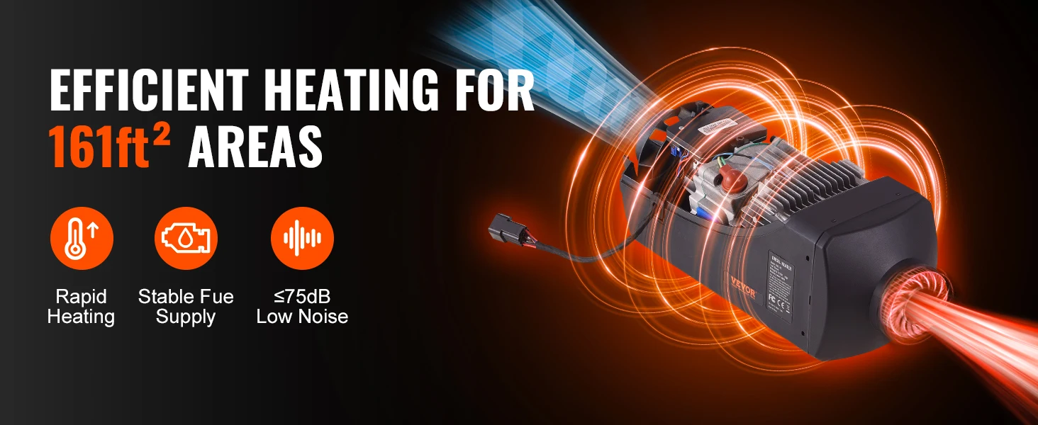 Efficient Heating: Heater Power: 5 KW; Rated Voltage: 12V. Applicable Range: 161-215ft⊃2;/15-20 m⊃2;. VEVOR diesel air heater adopts a sandblasting aluminum heat exchanger for rapid heat production and transfer, ensuring a comfortable temperature inside your vehicle, boat, or cabin within 10 minutes.