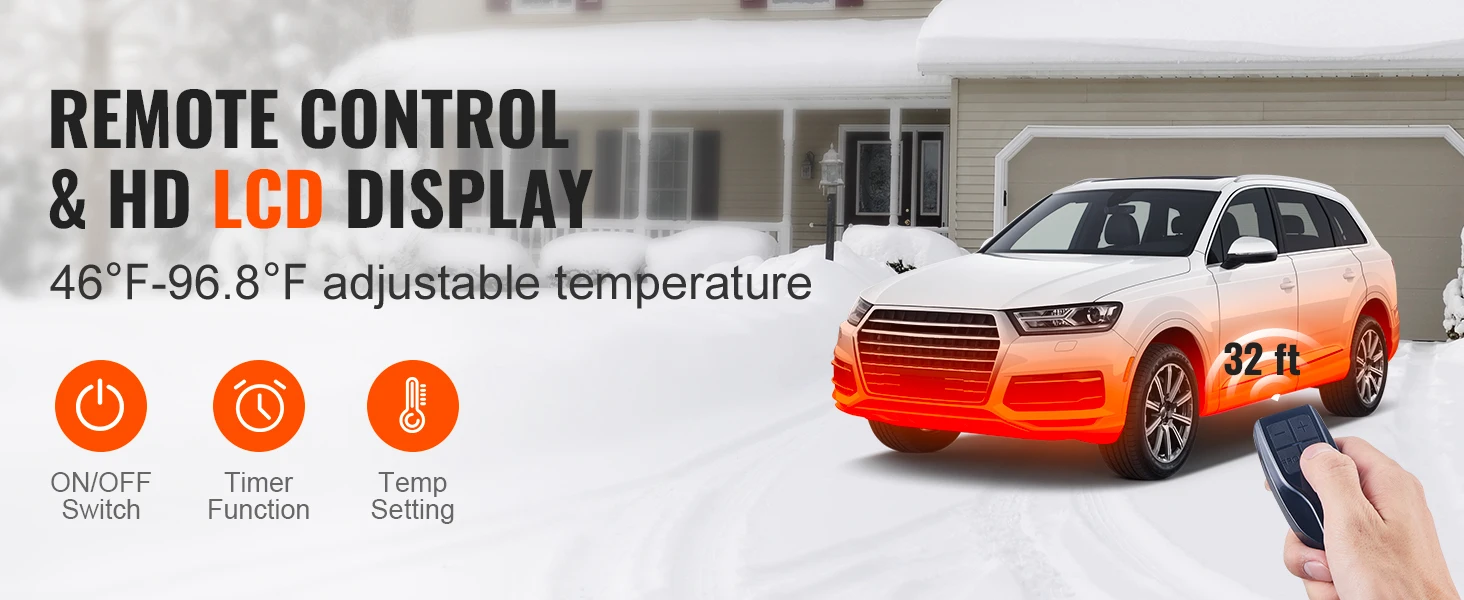 Intelligent Dual Control: Take control of your heating experience with our 32 ft long-distance remote control and LCD. Preheat your vehicle from outside, keep the interior warm, preheat the engine, and prevent window freezing. And the large LCD allows you to get a clear view of your heater's status. The temperature can be adjusted from 46 °F-96.8 °F/8 °C-36 °C, catering to your specific needs.