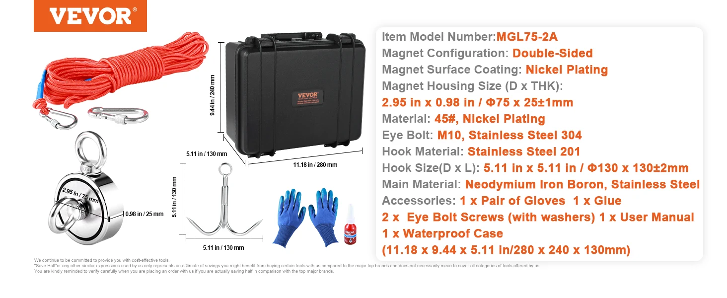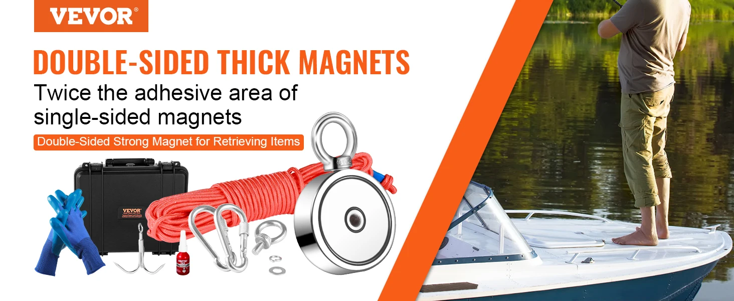 VEVOR High-Quality Double-Sided Magnet Fishing Kit Experience the incredible pulling strength of our fishing magnets. With an enhanced contact area from double-sided magnets, you will get twice the magnetic power...