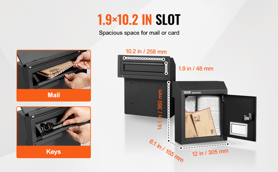 Large Storage Box & Slot: The through the door drop box includes a 12 x 6.1 x 14.1 inch storage box, providing 0.59 cubic feet of space, capable of accommodating various sizes of items. The 1.9 x 10.2 inch (48 x 258 mm) slot is suitable for smartphones, envelopes, and small parcels.