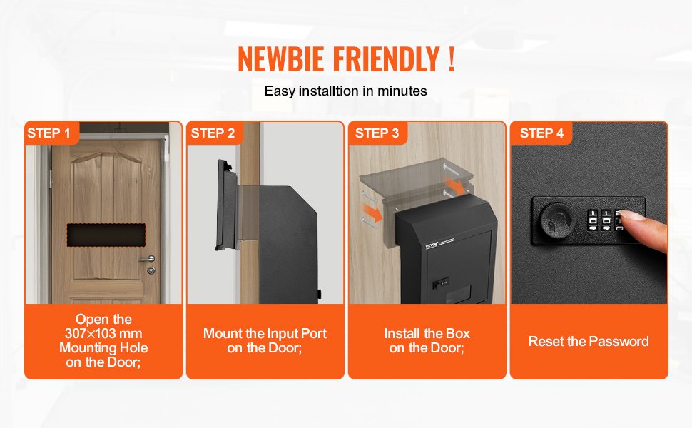 Our key drop box design considers every detail, making installation a breeze. Simply mark and open the installation holes on the wall, mount the delivery slot on the door, insert the mailbox into the door, and install it. Finally, reset the password, and your mailbox is ready to go!