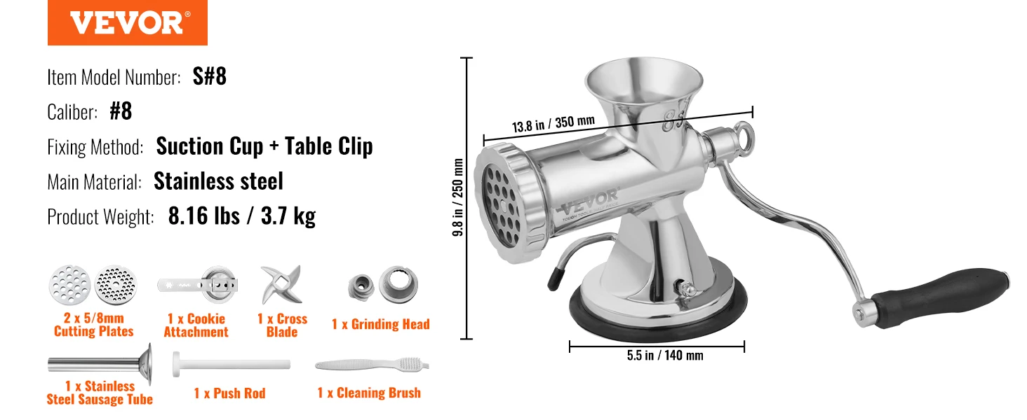 One Meat Grinder, Endless Uses: VEVOR multifunctional manual meat grinder allows for easy vegetables and meat grinding to make meatballs, cookies, sausages, and more. It also comes with 5mm and 8mm cutting plates, 1 cutting cross blade, 1 stainless steel sausage tube, 1 cookie attachment, 1 grinding head and meat pusher rod, catering to the diverse needs of different culinary creations.