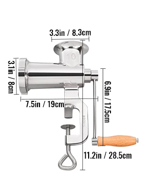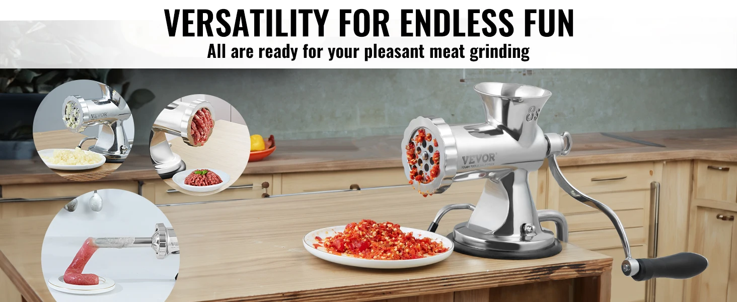 VEVOR 304 stainless steel manual meat grinder is a versatile and practical kitchen tool that provides convenience for homemade culinary delights. It combines suction cup and steel table clamp fixation, ensuring both stability and reliability. Enhance your cooking with endless fun and creativity!