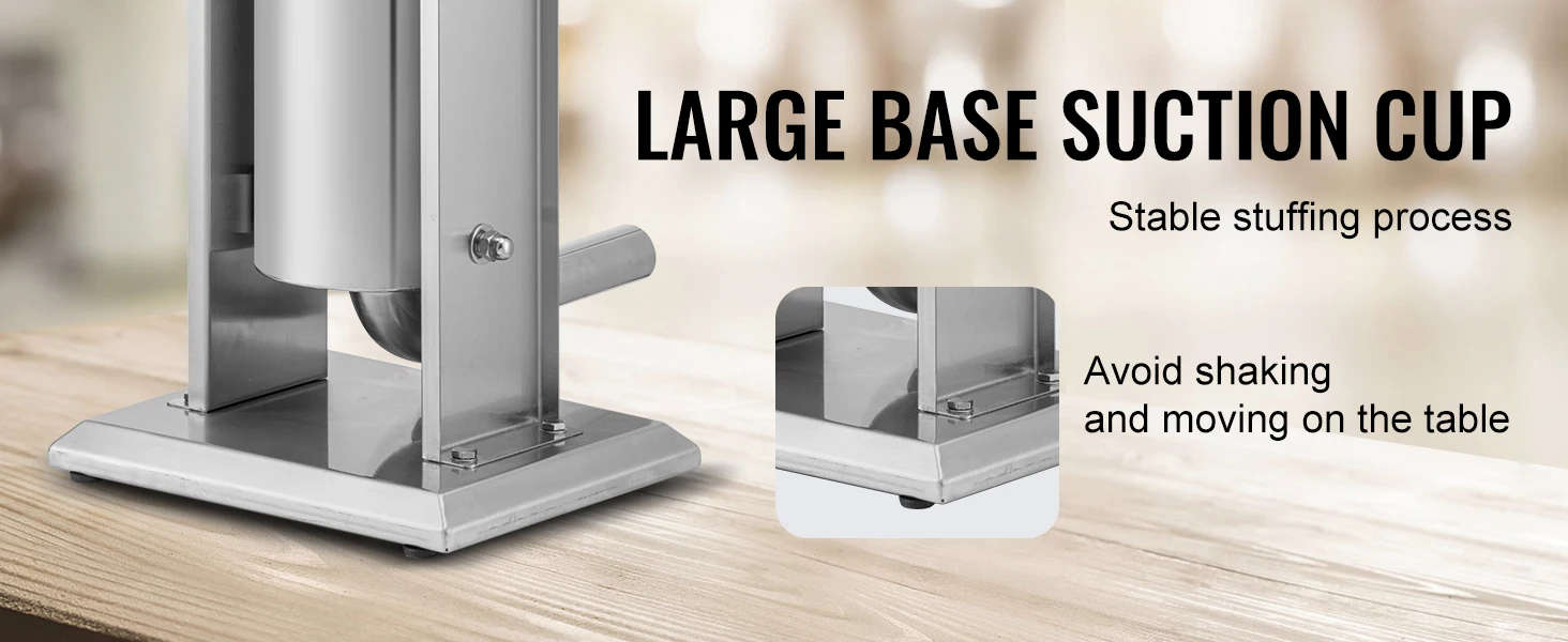 A: The material of this product is FDA certified, no harmful substances are precipitated, so it is more secure. Q: Will it shake during use? A: Four large suction cups are added to the bottom of this model to firmly hold the table top and prevent it from sliding around. Q: Do I need to assemble it? A: No assembly is required, it can be used after unpacking. Q: How do I fill the sausage casing with remaining meat filling? A: The complimentary manual piston can easily fill the remaining meat into the casing, avoiding the waste of meat.
