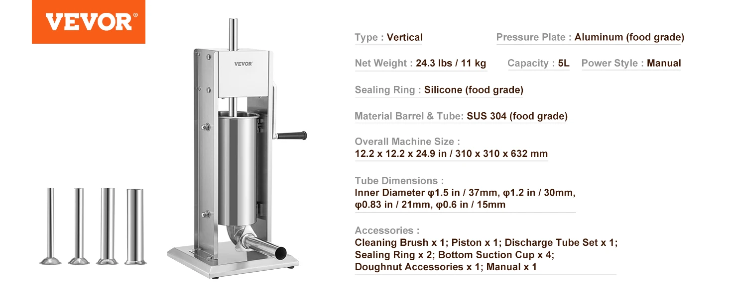 Includes 4 Filling Tubes: This vertical sausage stuffer comes with four stainless steel stuffing tubes (Φ15 mm, Φ21 mm, Φ30 mm, Φ37 mm) and fried dough sticks, meeting different size requirements to make thin Italian fine sausages, flavored salami, or thicker meat sausages.
