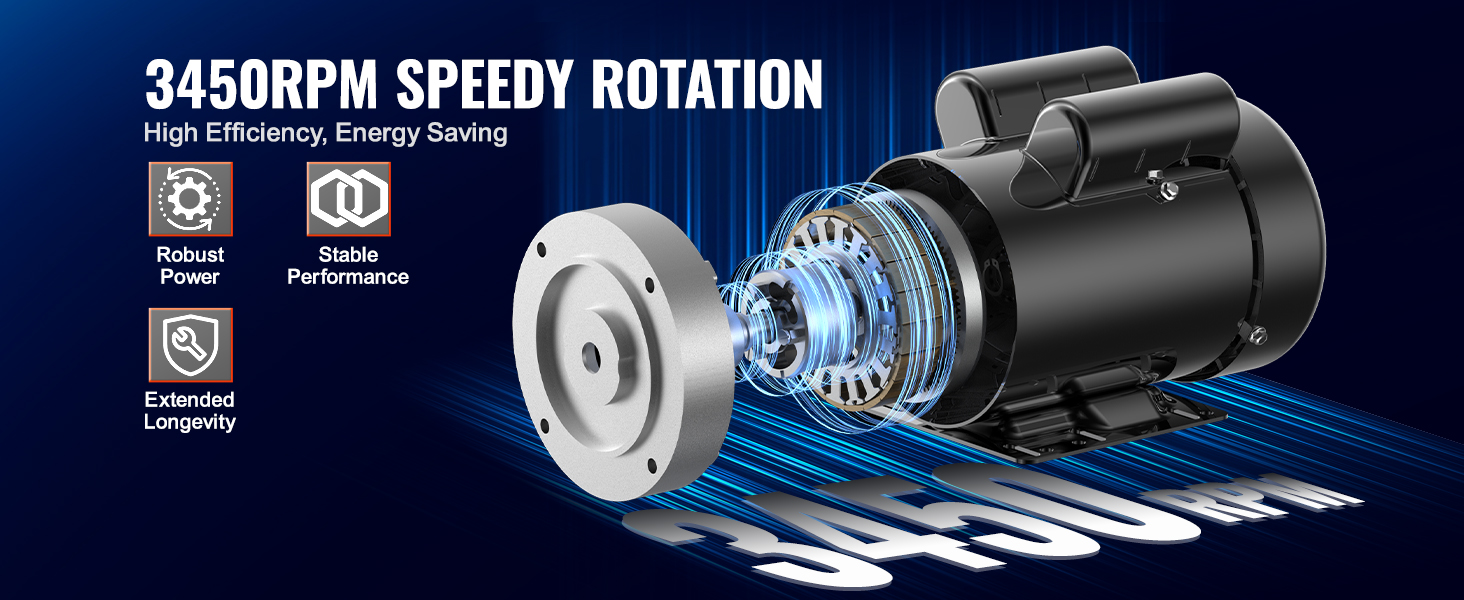 Powerful Performance: 1.5HP, Single Phase, Full Load Current: 15.0/7.5A, AC 115V/230V 60Hz, 3450 RPM High Speed, SF: 1.15.