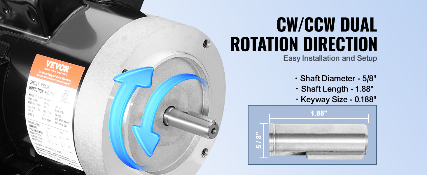 Dual Rotation Direction: Our electric motor offers reversible CW/CCW rotation, simplifying wiring installation and providing quick, versatile connections for various applications.