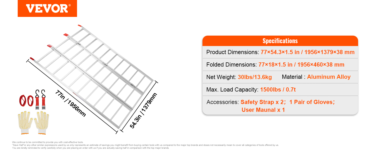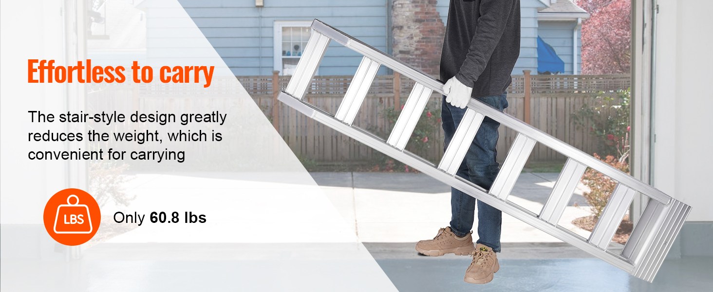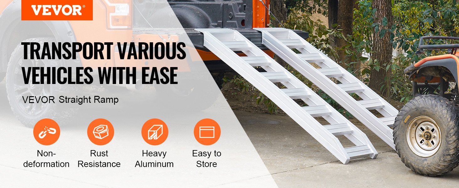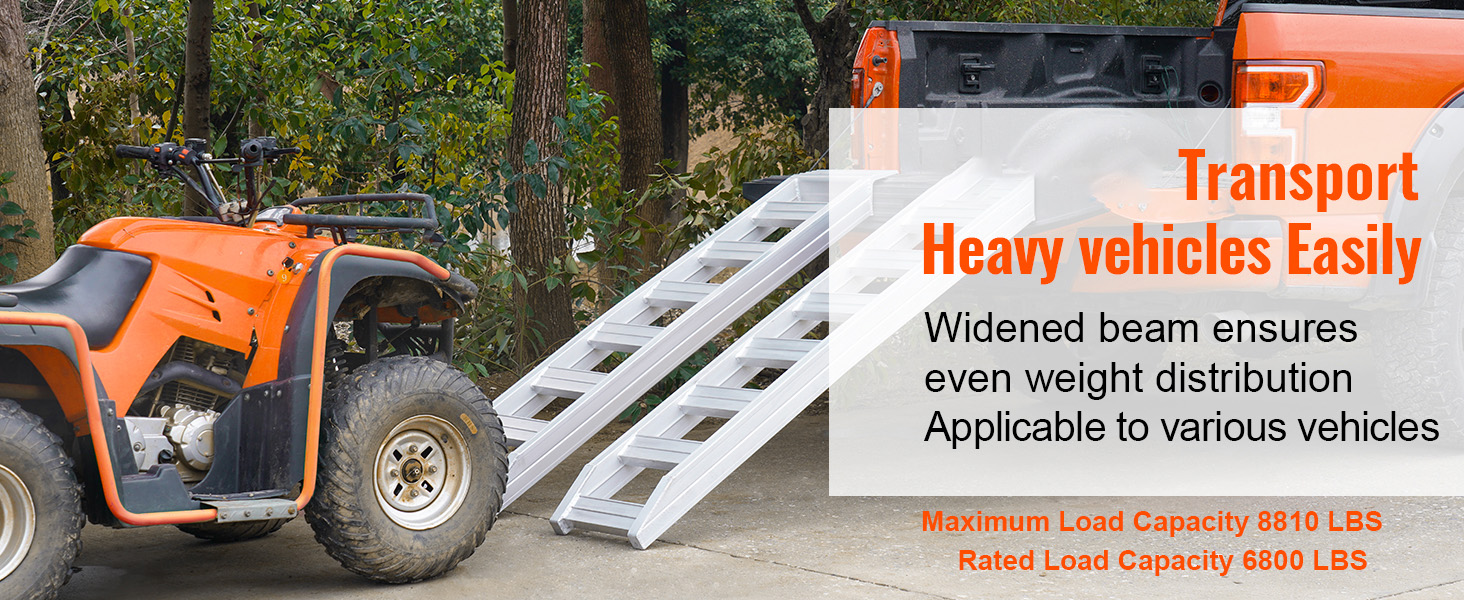 • Lightweight but Durable: The VEVOR ramps are the perfect combination of quality and strength. Made from premium aluminum alloy and tested for security, the truck ramps can support up to 8810 LBS while weighing only 60.8 LBS. Transporting your tractors, ATVs, UTVs, motorcycles, or bicycles has never been easier!