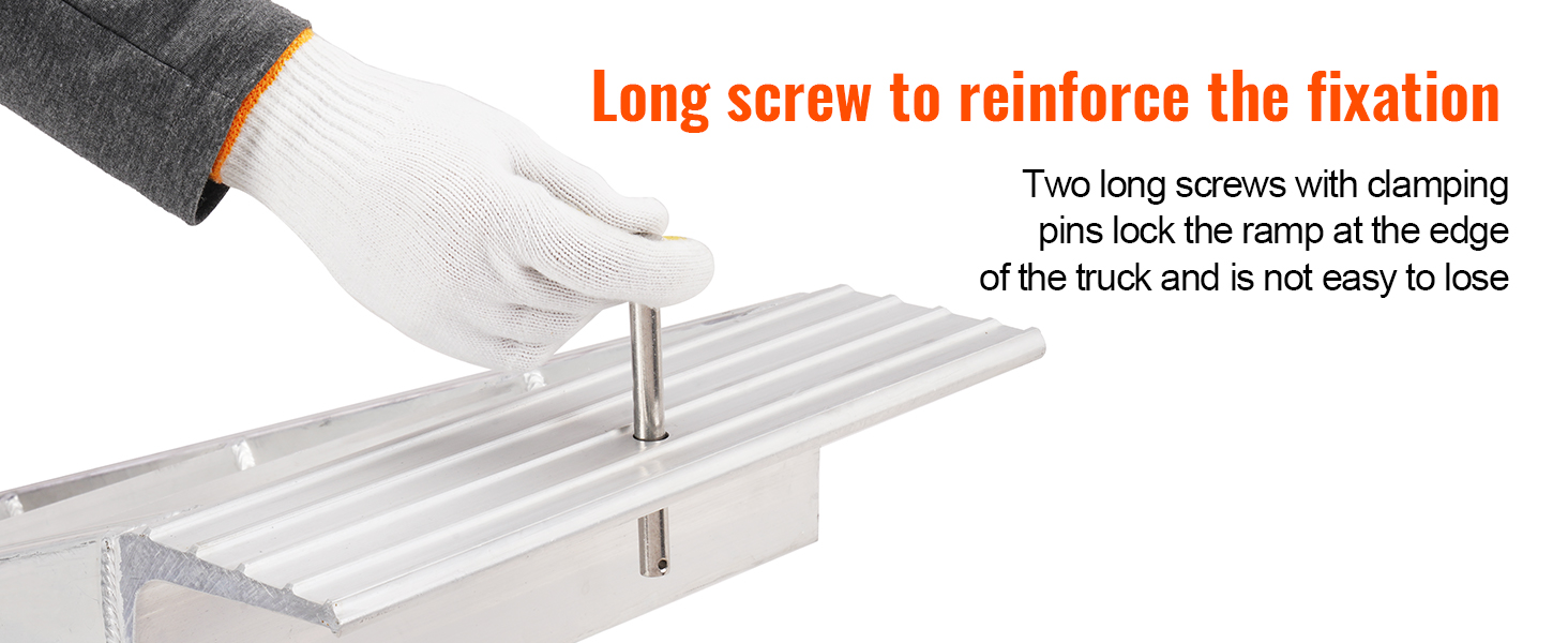 What type of vehicle is this ramp suitable for transportation? The bearing capacity of this ramp is 8810 lbs, which is more suitable for heavy-duty tractor, ATV, UTV, motorcycles, hand truck, bicycles and other vehicles. Please note: Do not exceed the weight capacity to prolong the ramp's lifespan. What's in the package? The ramp kit includes 2 x straight ramp, 2 x Ø12*130 mm stainless steel long screw (with pin), 1 pair of gloves, 1 x instruction.