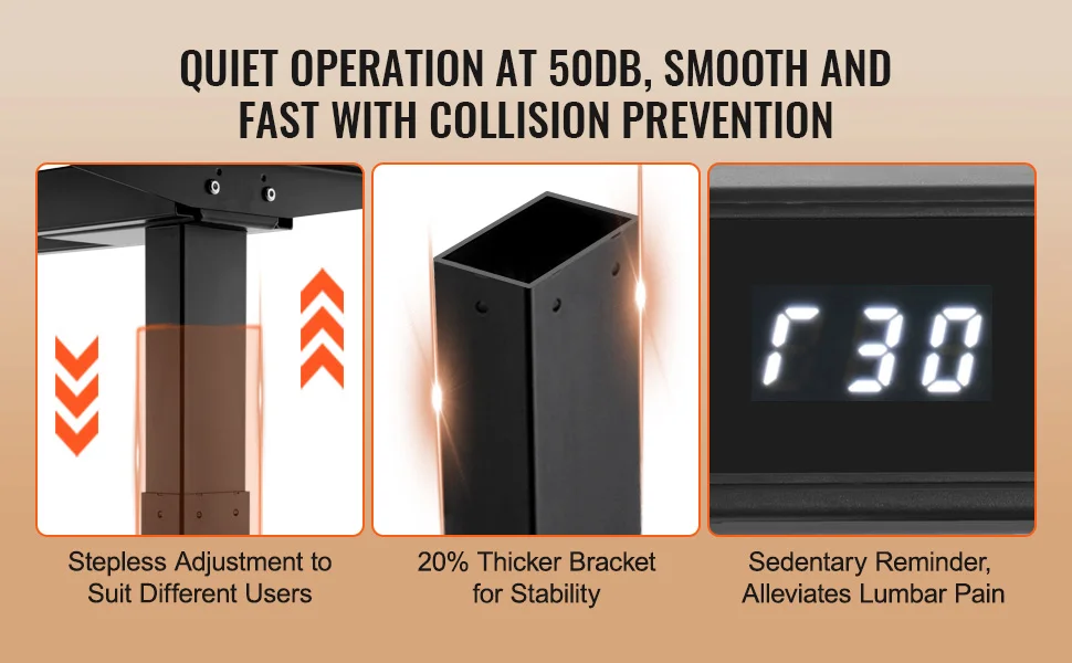 Featuring noise levels below 50 decibels during height adjustment, this desk operates smoothly and rapidly, with anti-collision design for added security. Its stepless height adjustment caters to various user needs, while the reinforced bottom bars ensure stability and prevent shaking.