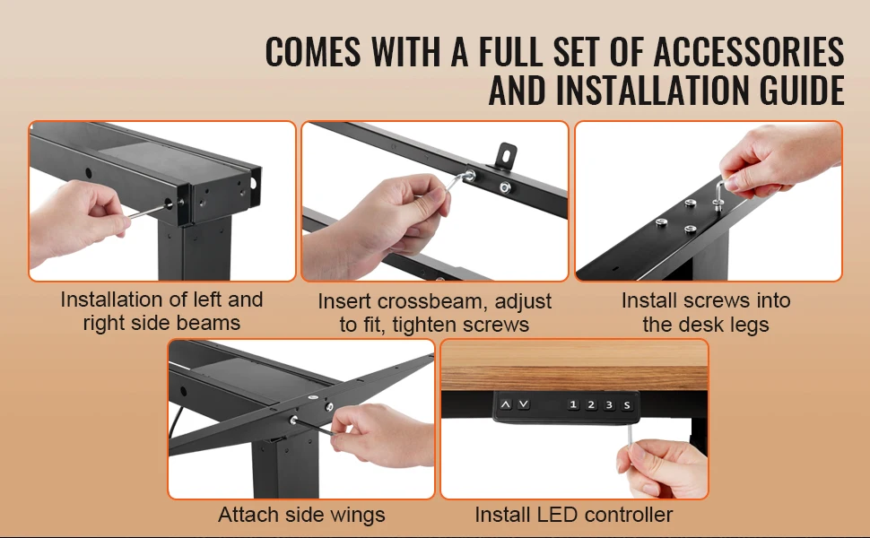 This standing desk comes with a complete set of accessories and a clear, easy-to-follow installation guide. When dealing with uneven surfaces, the footpads can be adjusted to ensure balance.