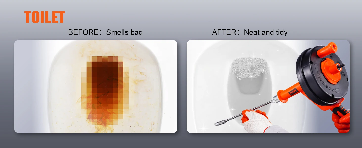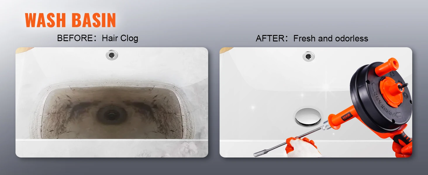 Multifunctional Drain Cleaner: VEVOR handheld plumbing snake drain auger offers good versatility and cost effectiveness, quickly clearing debris from the most stubborn drains such as tea, peel, food residue, paper, bone, hair, and clothing unclogged in toilets, sewers, floor drains, sinks, pipelines, bathtubs.