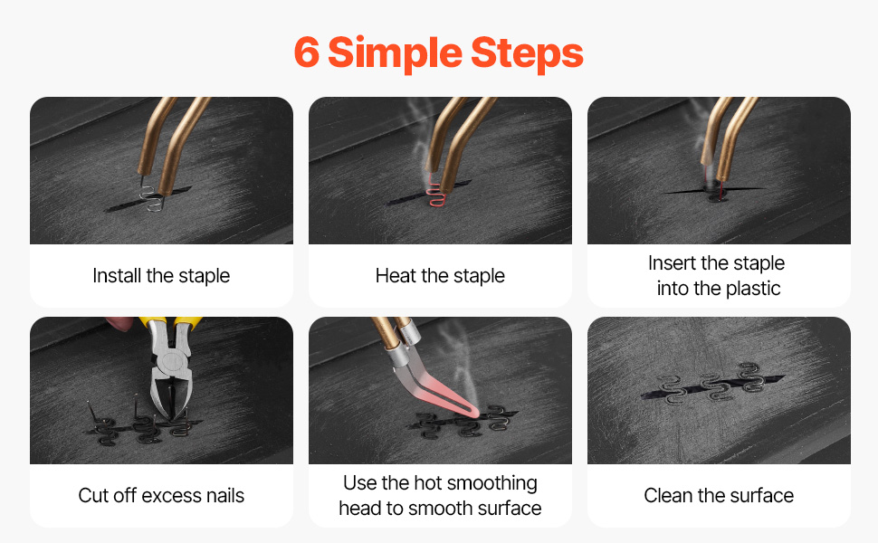 Wide Applications: This battery-powered plastic welder offers 400PCS 4 types of hot staples for various plastic repair needs. With large and small wave staples, V-shaped, and M-shaped staples, it's ideal for repairing car bumpers, dashboards, lamp bases, plastic rings, motorcycles, and daily plastic items.