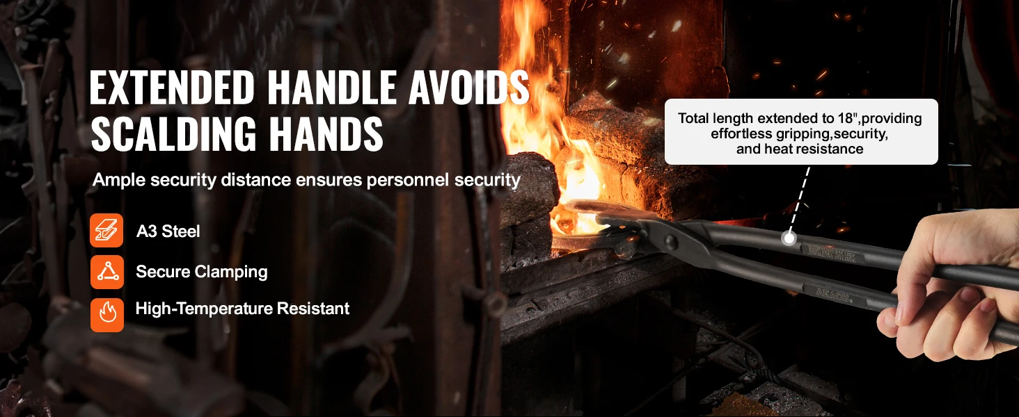 18" Extended Total Length: The uniquely designed long handle of the forge tongs ensures security by keeping users away from heat sources. Feel the difference as you work with confidence and precision without worrying about burns or discomfort.