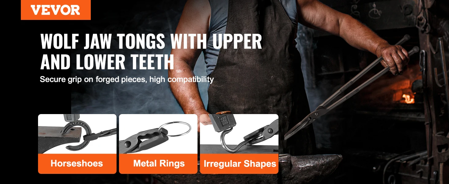 Wolf Jaw Tongs: The jaws of our blacksmith tongs feature upper and lower biting teeth, making it convenient to grip various shapes of forgings and shape them. They are primarily designed for horseshoes, curved shapes, block forgings, and unique shapes.