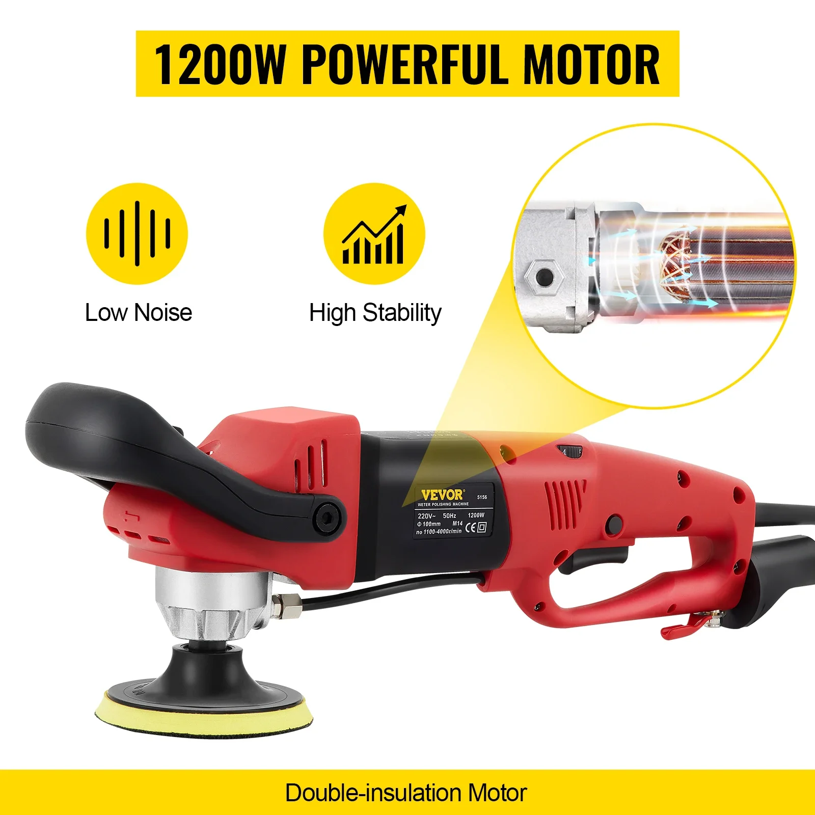 【Ergonomic Design】: All the handles (Back & Top & Side Handle) are designed with you in mind, ensuring extended use and comfortable operation. The top handle quickly provides adequate pressure on the surface for the best polishing result. An extra side handle can supply more power and make the process more stable. Head heavy polisher transfers maximum weight onto polishing surfaces to polishing more accessible, better, and faster.
