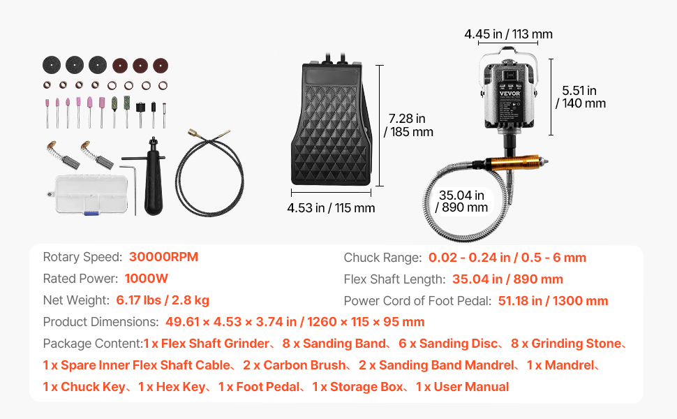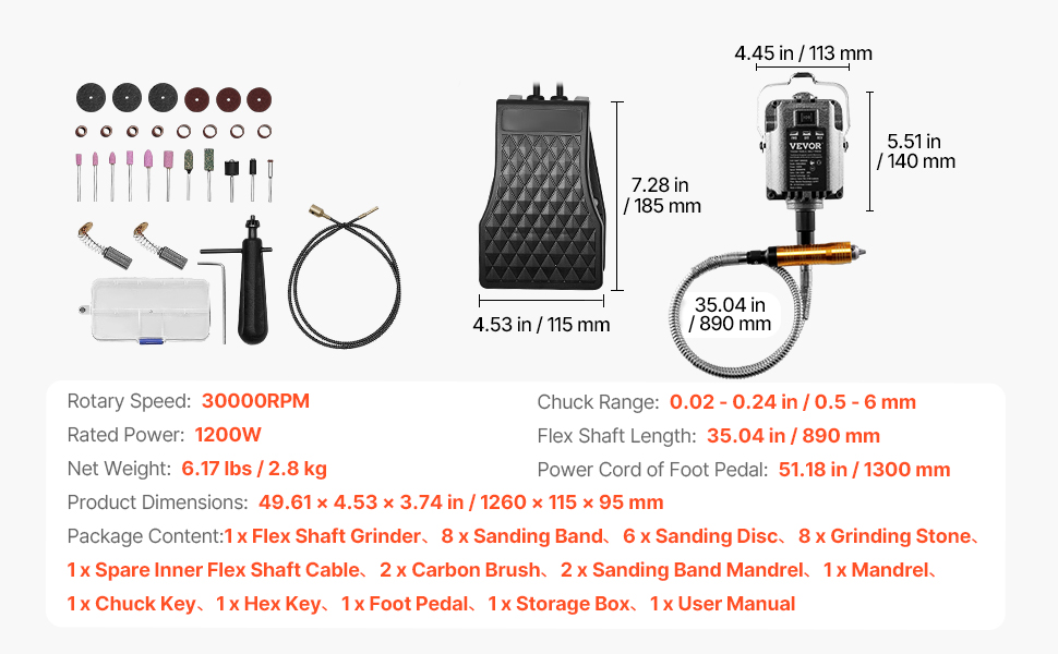Complete Accessories: This hanging grinder carver comes equipped with all the essentials for grinding and polishing, including sanding bands, discs, grinding stones, and mandrels, along with spare inner flex shaft cable, carbon brushes, foot pedal, and storage box—ideal for professionals and DIY enthusiasts alike!