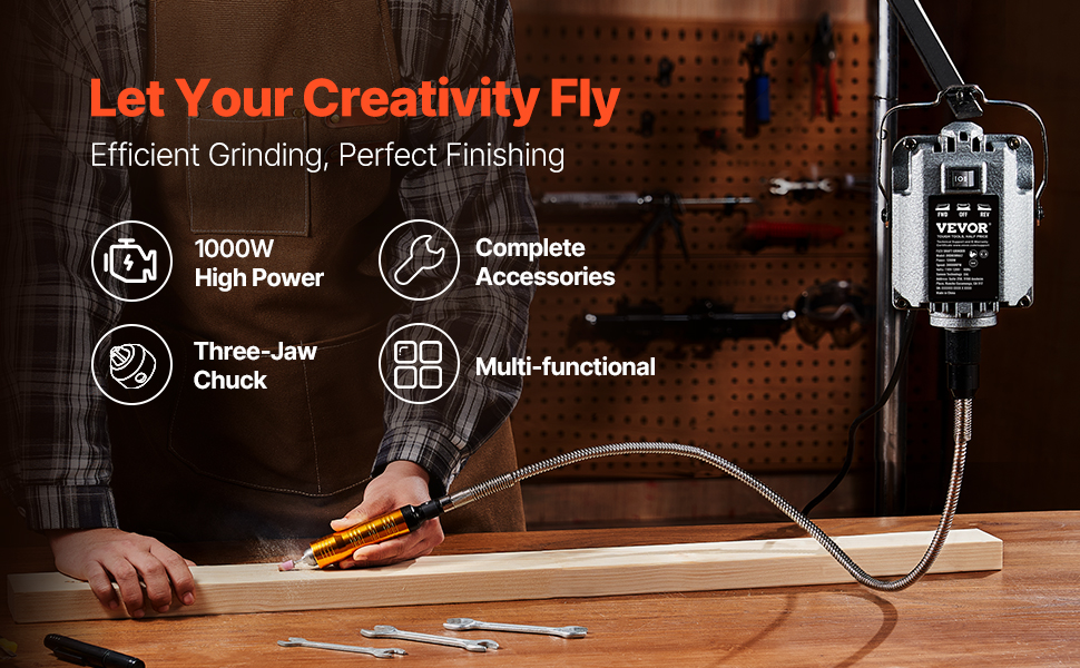 This 1000W flex shaft grinder, featuring a premium copper motor and up to 30,000 RPM, is ideal for carving, polishing, drilling, and more. The 3-jaw chuck and 35-inch extended flexible shaft add convenience and flexibility to every project. Ideal for craftsmen and DIY enthusiasts alike!