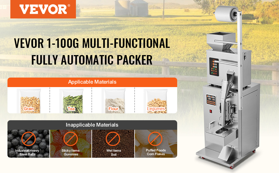 Fill with Ease: Our automatic weighing filling packing machine handles particles up to Φ<5 mm, and it doesn't stop there! It effortlessly fills everything from seasoning powder to tea leaves and even grains. Note: The machine does not come with film rolls, and you need to purchase them separately.