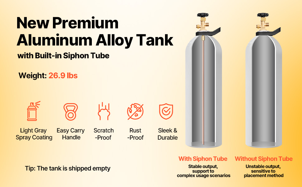 • Compact, Durable 20 lbs CO2 Tank: Our CO2 tank boasts a lightweight 26.9 lbs aluminum alloy body for exceptional strength and resistance. The light gray spray coating enhances its visual appeal and keeps the tank from wear and tear. Tip: The tank is shipped empty