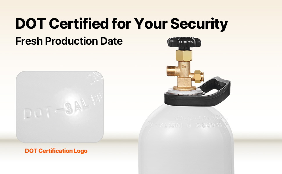 Our CO2 gas tank is DOT-approved, featuring all necessary external markings. Each unit is stamped with a fresh production date, ensuring you receive a brand-new, reliable aluminum CO2 tank.