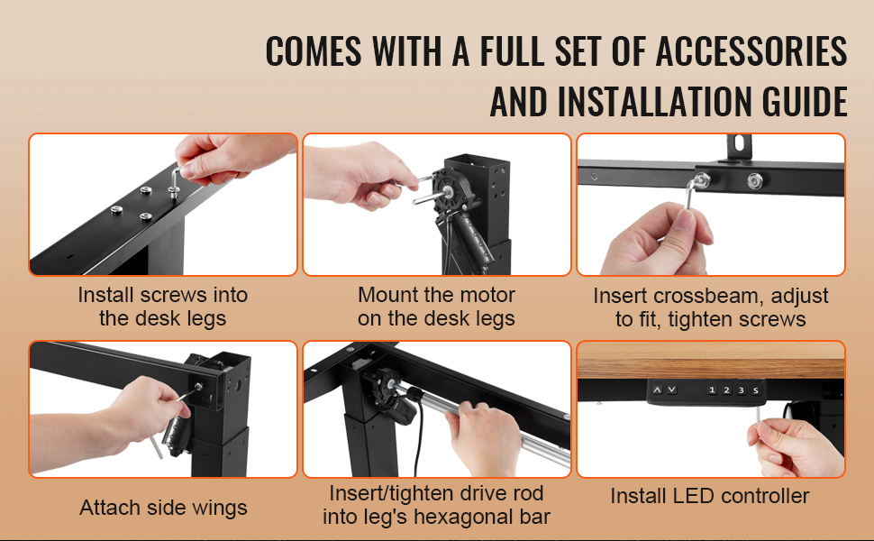This standing desk comes with a complete set of accessories and a clear, easy-to-follow installation guide. When dealing with uneven surfaces, the footpads can be adjusted to ensure balance.