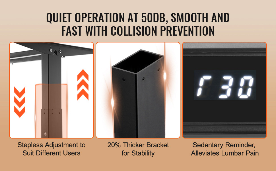 Featuring noise levels below 50 decibels during height adjustment, this desk operates smoothly and rapidly, with anti-collision design for added security. Its stepless height adjustment caters to various user needs, while the reinforced bottom bars ensure stability and prevent shaking.