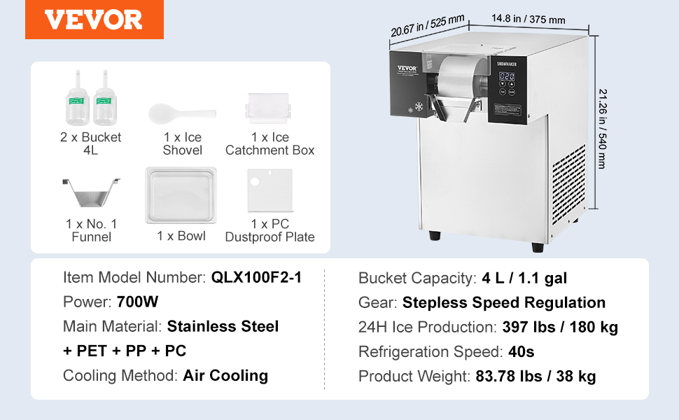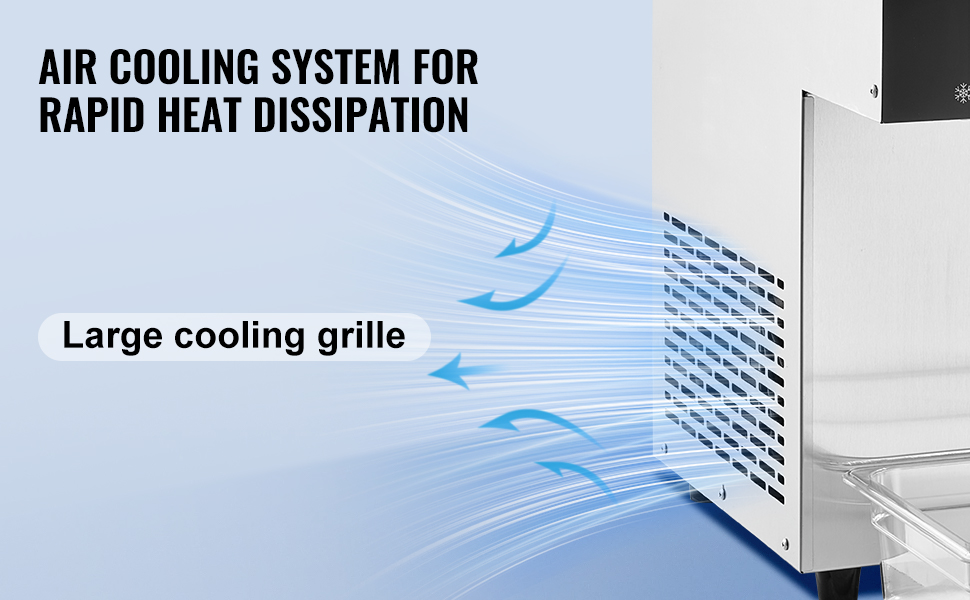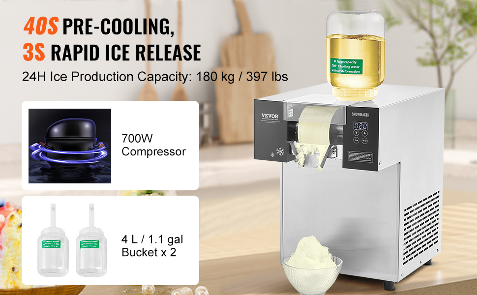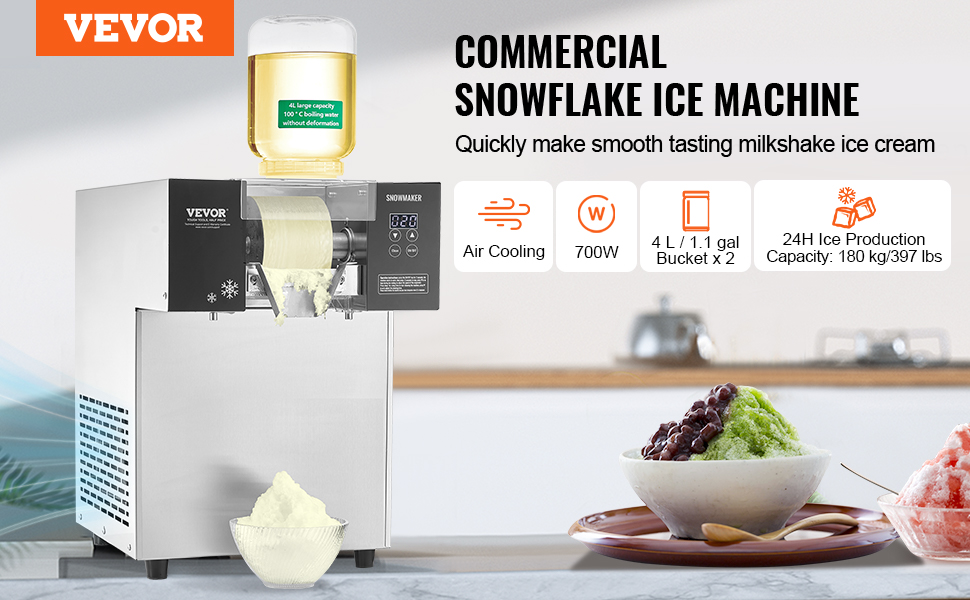 Efficient, Continuous Ice Production: The commercial snowflake ice machine features a high-performance stable air-cooling system, achieving quick cooling in 40 seconds and producing ice in just 3 seconds after pre-cooling, capable of producing approximately 397 lbs / 180 kg of ice per day, ideal for making various beverages such as sugar drinks, alcoholic drinks with an alcohol content of less than 10°, fruit juice drinks, and milk.