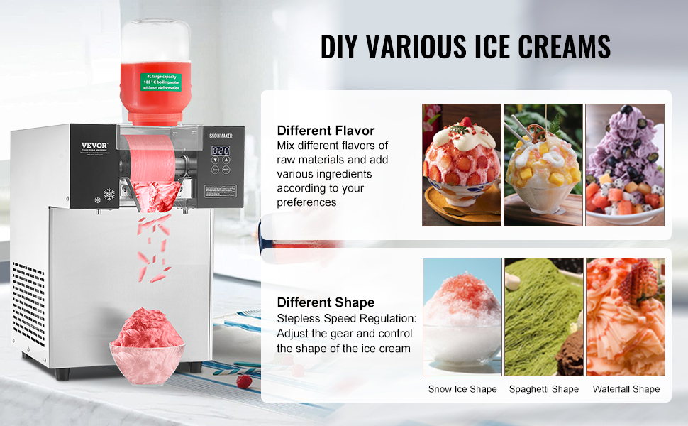 Variety of Ice Shapes: By adjusting the roller speed, this snowflake ice machine creates various textures of ice cream, such as snow ice shape, spaghetti shape, and waterfall shape, each offering a silky smooth texture.
