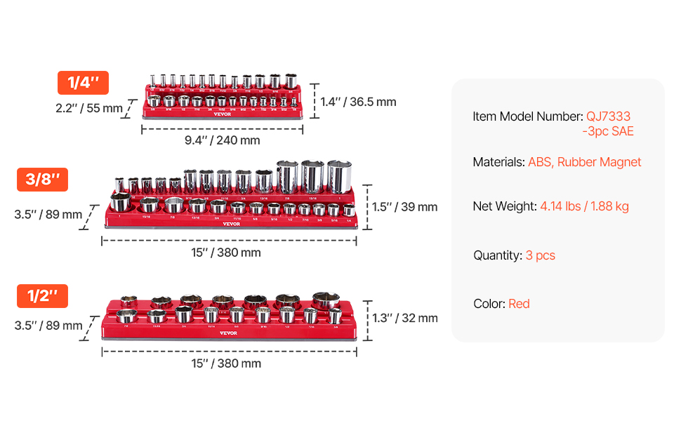 Professional Design: Crafted to meet industry standards, our red socket organizers are specifically designed for SAE sockets (1/4", 3/8", and 1/2" drive). These magnetic socket holders simplify organization, allowing you to quickly locate the right socket when needed, enhancing your work efficiency.