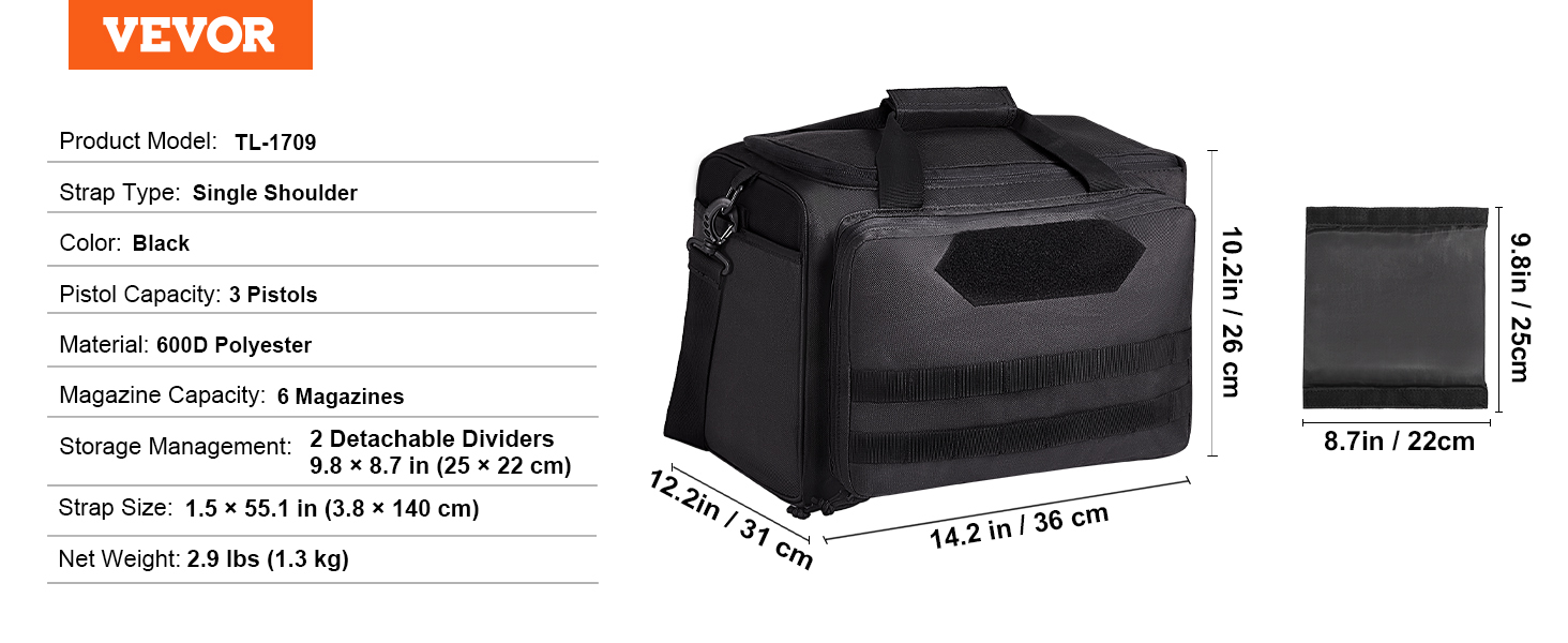 【Tactical Gun Bag】This lightweight range bag exterior measures 14.6 x 10.2 x 9.1 in, suiting for most pistol sizes.