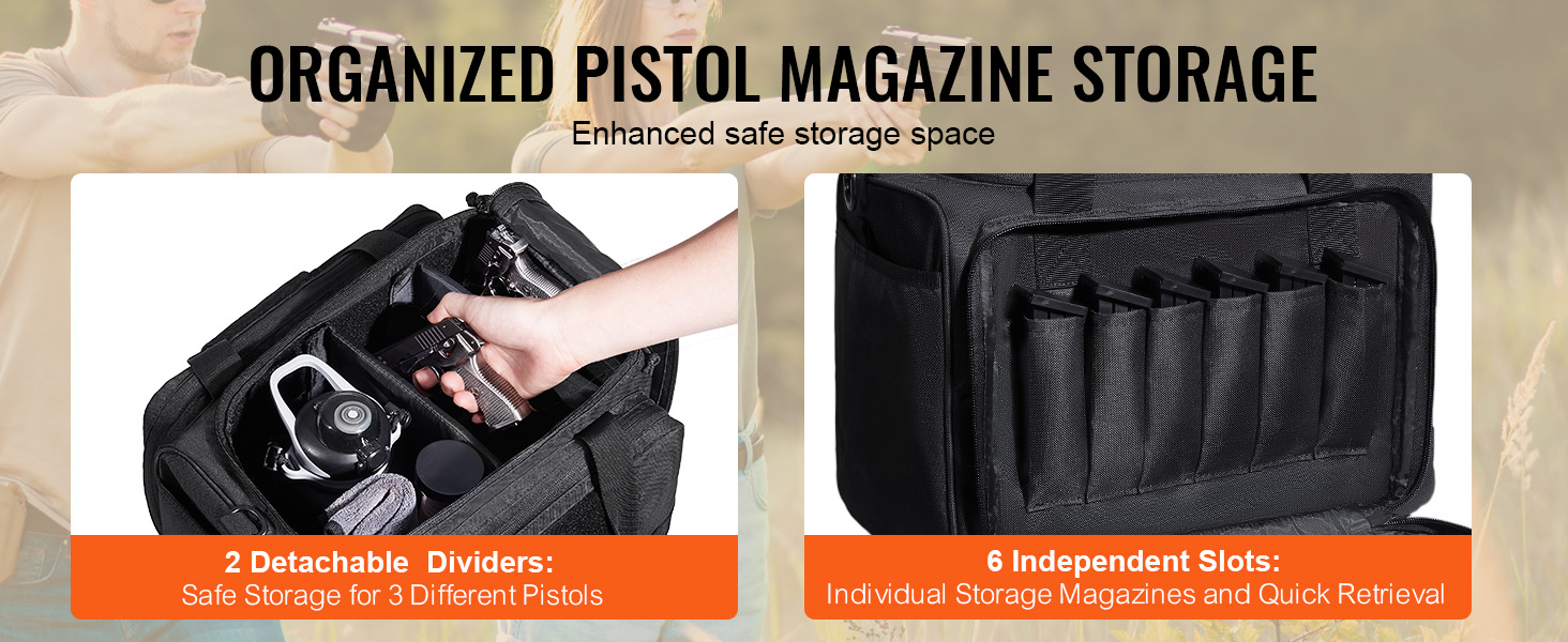 【Spacious Storage】The main compartment of this gun bag has 2 removable dividers, allowing you to store 3 handguns of different sizes. The front pocket is designed to hold 6 magazines, ideal for rapid reloading during intense hunting. As well as external front and back zipper pockets for items like ear protection, safety glasses, a flashlight, gloves, a phone, and a wallet.
