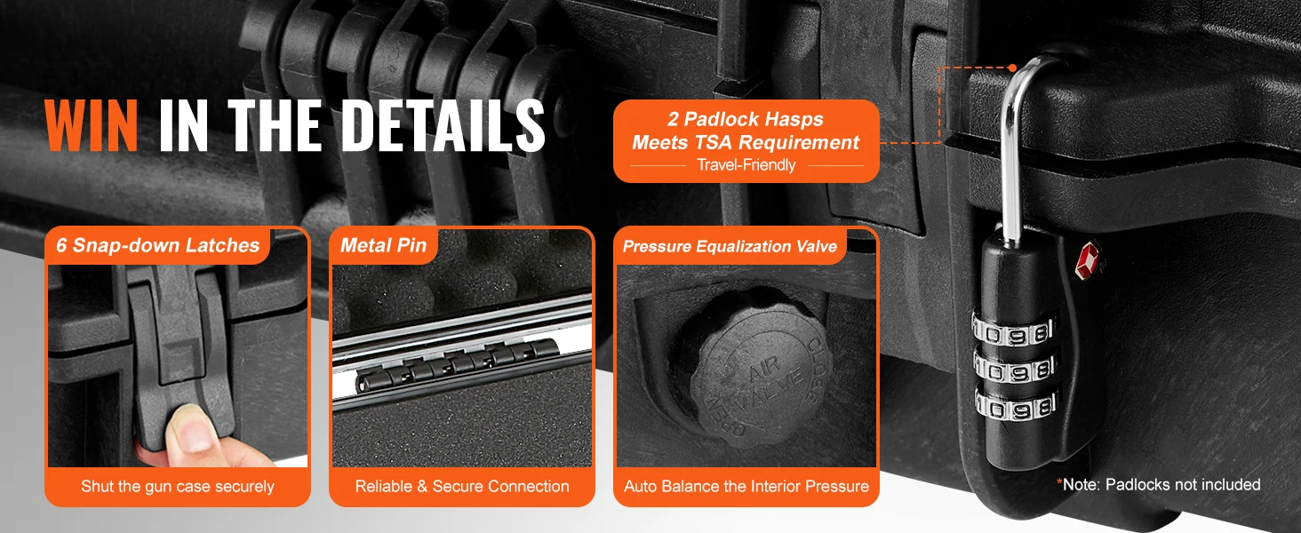 Designed to meet TSA requirements, our rifle case has 2 padlocks to secure your rifles effectively. The snap-down latches are easy to open and close. The metal hinge pins provide a secure and reliable connection. The pressure equalization valve helps regulate and balance the air pressure.