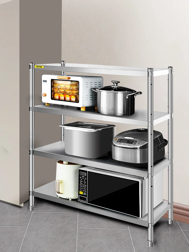 Reliable Properties: This 4-tier shelf unit with a brushed surface is stainless steel, ensuring perfect solidity, rust-proof, and easy-cleaning for durable use. The back of its tier adopts a crossbeam design, incredibly stabilizing the whole structure. In addition, the shelves contain vent holes for improving air flow, maintaining the freshness of your stored food.