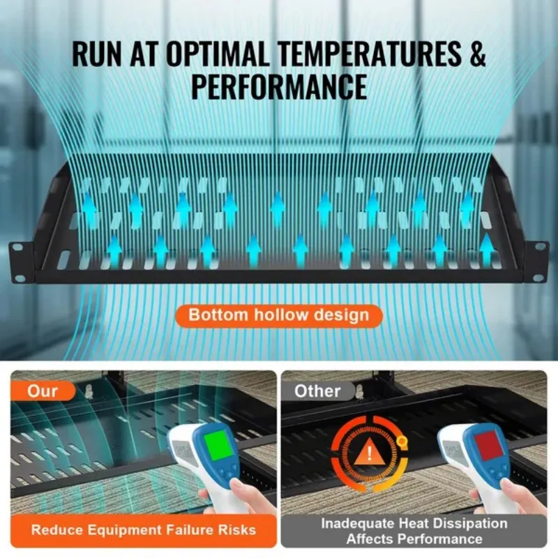 · Optimal Ventilation: Featuring a perforated bottom design, our network rack shelf effectively reduces equipment temperature, ensuring stable operation and lowering the risk of malfunctions. Keep your gear running smoothly for longer-lasting, reliable performance.