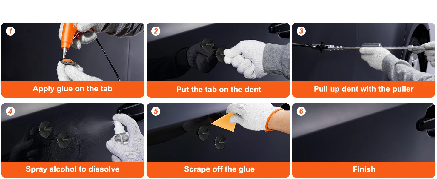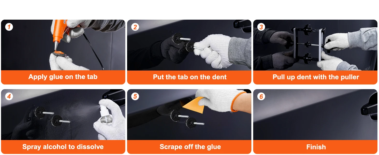 How to Use It: 1. Clean the dent surface and apply a hot glue stick on the puller tab. 2. Put the puller tab on the dent and wait a few minutes. 3. Place the lift puller to pull up the dent. 4. After the dent is out, spray alcohol on the tab and use a scraper to clean the glue. Following the above steps, you can quickly repair car dents, door dents, hail damage, and other dents. Suitable for cars, refrigerators, washing machines, and other metal surface dents.